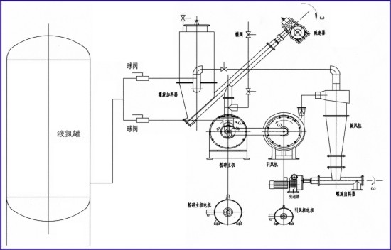 1、工藝流程:本產(chǎn)品整套超低溫機(jī)械粉碎機(jī)由料倉(cāng)、機(jī)械粉碎機(jī)、引風(fēng)機(jī)、旋風(fēng)器、出料器、液氮罐(用戶(hù)自配)等組成;